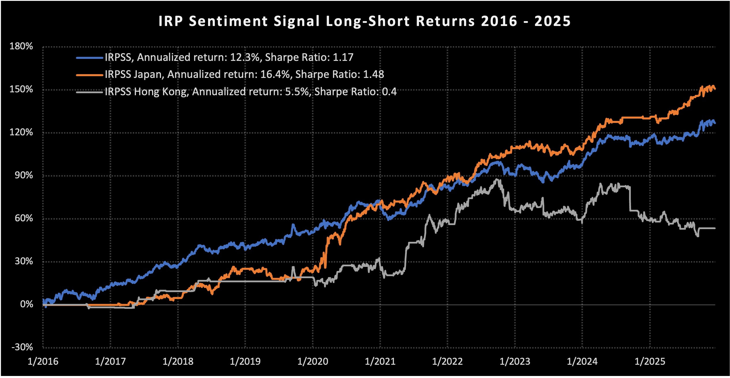 Discretionary institutional investors have been consuming IRP research reports for some time, either directly from the IRPs or through platforms, but until now there has not been a straightforward way for systematic investors to receive sentiment signals based on IRP content in a way that is analogous to their consumption of traditional sell side research through aggregators such as the I/B/E/S or FactSet databases.