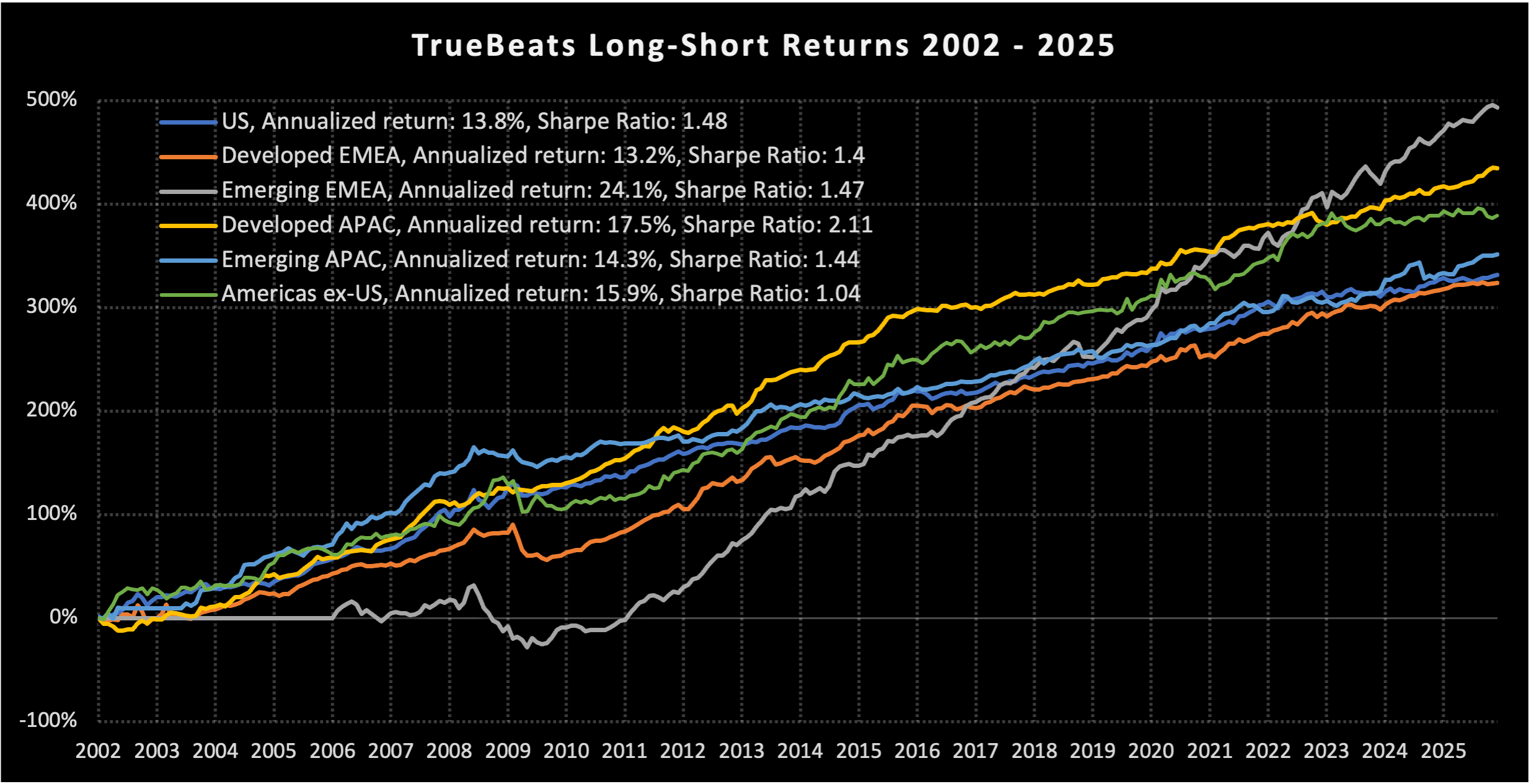 TrueBeats are early indicators not just of earnings and revenue surprises but also of returns. Stocks with the largest positive EPS TrueBeats have outperformed those with the largest negative EPS TrueBeats by 13.4% to 23.5% per annum in every region for the 2002-2024 period, with long-short gross Sharpe ratios between 1.4 and 2.1 and with modest turnover.
